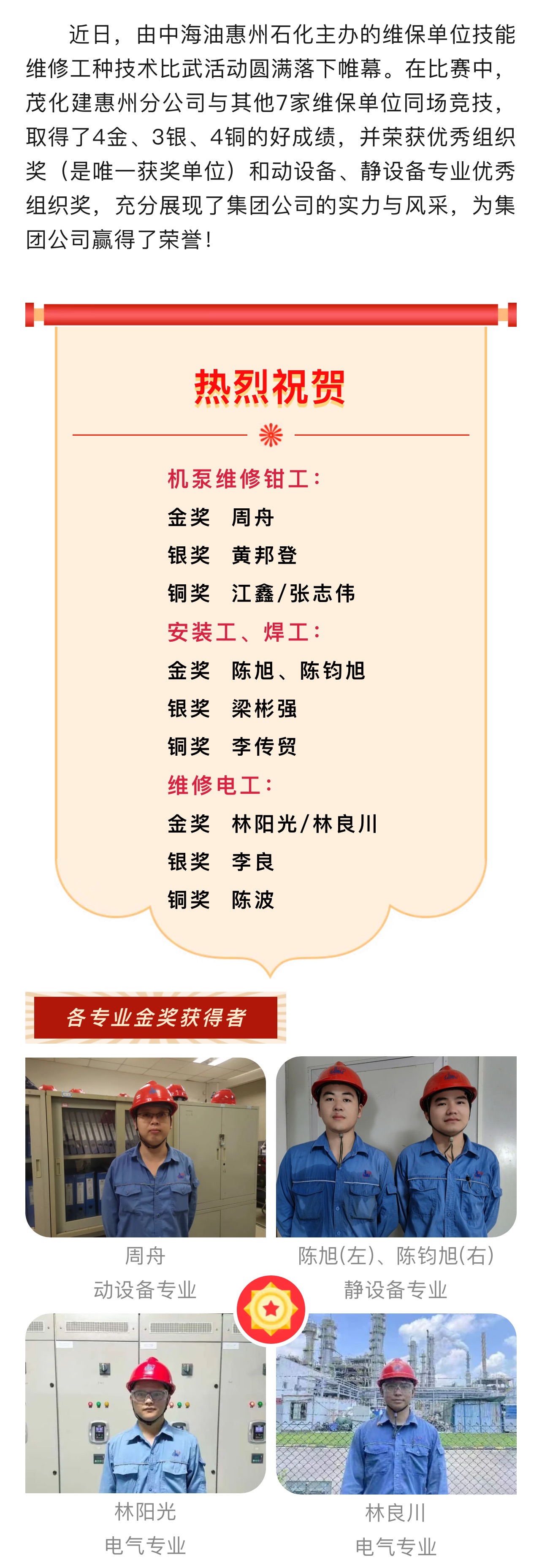 喜訊:惠州分公司在惠州石化維保單位技能維修工種技術(shù)比武中獲佳績(jī)