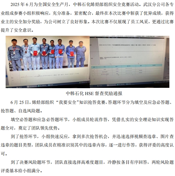 武漢分公司參加烯烴安全知識競賽獲獎勵